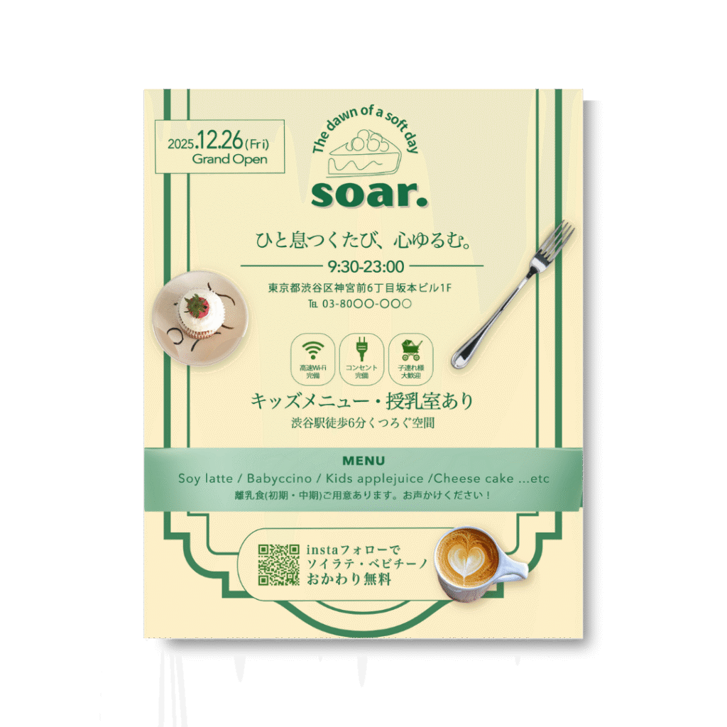 【Soar.】バナー制作(架空案件) Outline 制作概要 渋谷エリアにオープン予定のカフェ【Soar.】のバナーを制作いたしました。【自主制作】設定したペ…